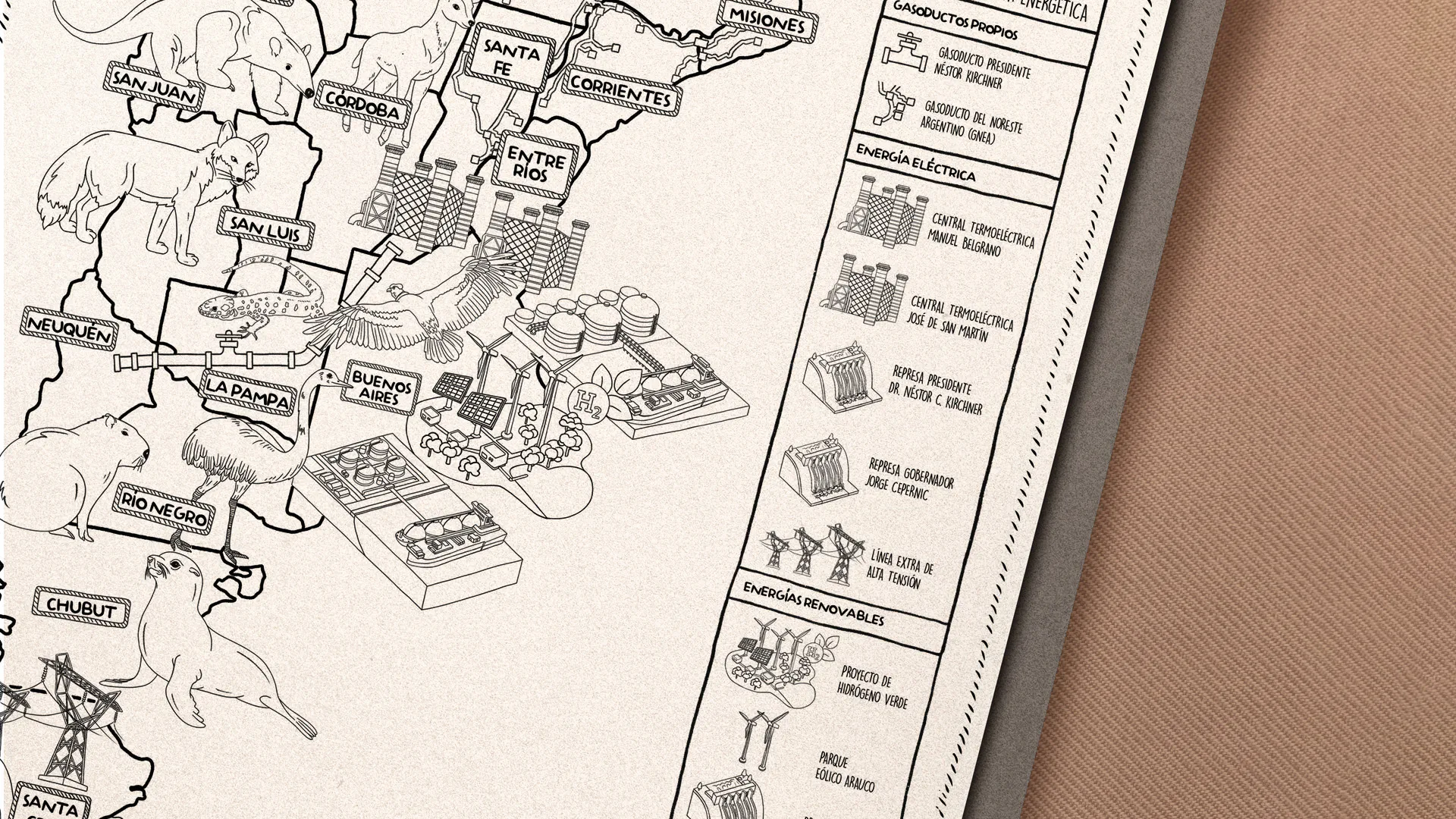 Development of illustrations to showcase the various energy-related projects in our country and the typical fauna of each of the Argentine provinces. The illustrations were applied to various pieces within the Energía Argentina stand at Tecnópolis.